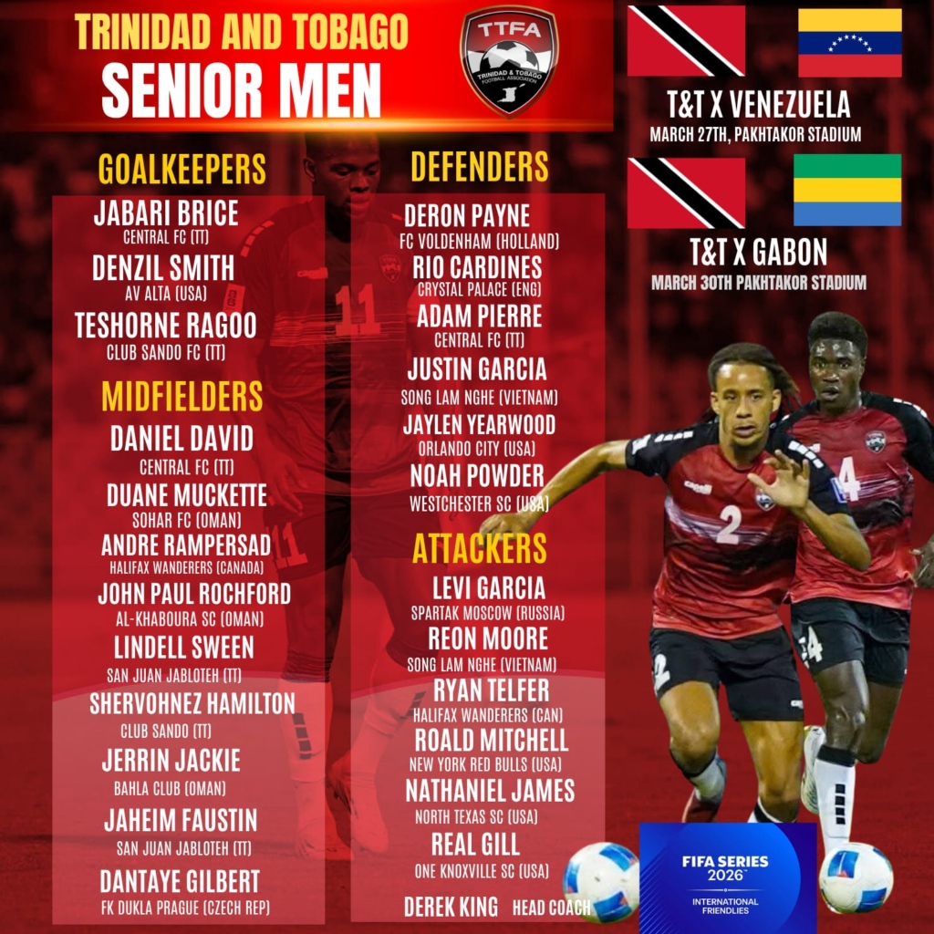 The Trinidad and Tobago Football Association has officially announced a 24-man Trinidad & Tobago squad for the upcoming FIFA Series 2026 in Uzbekistan, as the national team prepares to face Venezuela (March 27) and Gabon (March 30) at the Pakhtakor Stadium in Tashkent.