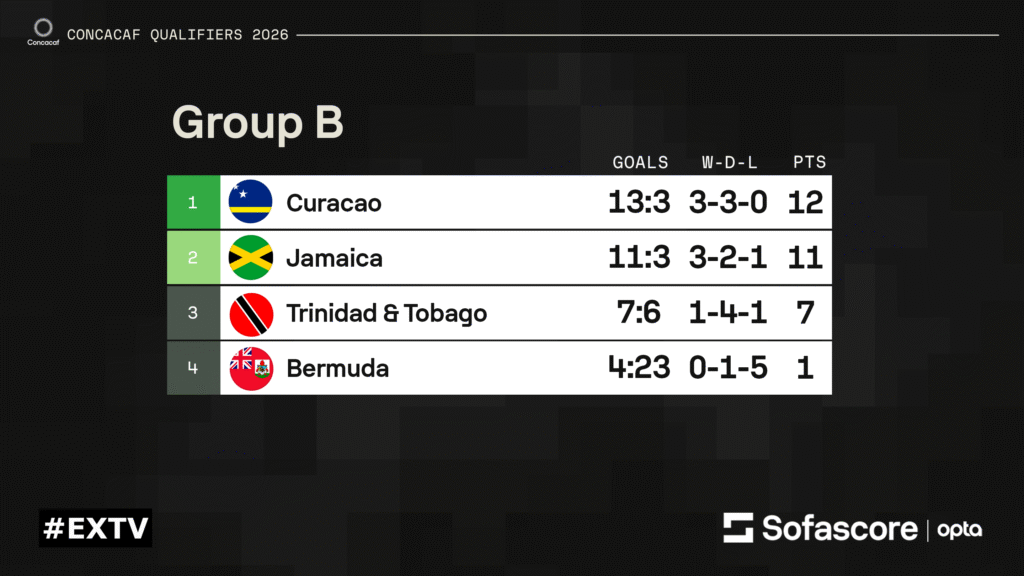 Trinidad & Tobago’s bid for the 2026 FIFA World Cup ended after a 1–1 draw at home to Jamaica. The Soca Warriors finished 3rd in Group B with: